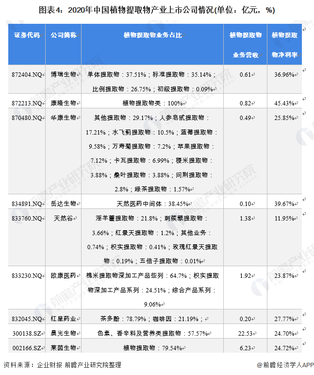 植物提取物产业主要上市公司:博瑞生物(872404.NQ)、康隆生物(872213.NQ)、华康生物(870480.NQ)、岳达生物(834891.NQ)、天然谷(833760.NQ)、欧康医药(833230.NQ)、红星药业(832045.NQ)、康恩贝(600572.SH)、晨光生物(300138.SZ)、莱茵生物(002166.SZ)、海正药业(600267)