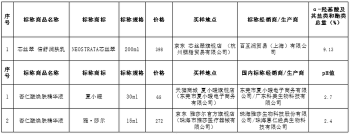 另外,本次试验还发现,部分样品明示含酸成分或含量与实测不符,如标称由东莞市夏小暖电子商务有限公司委托生产销售的夏小暖杏仁酸焕肤精华液检出未标注成分水杨酸0.31%。