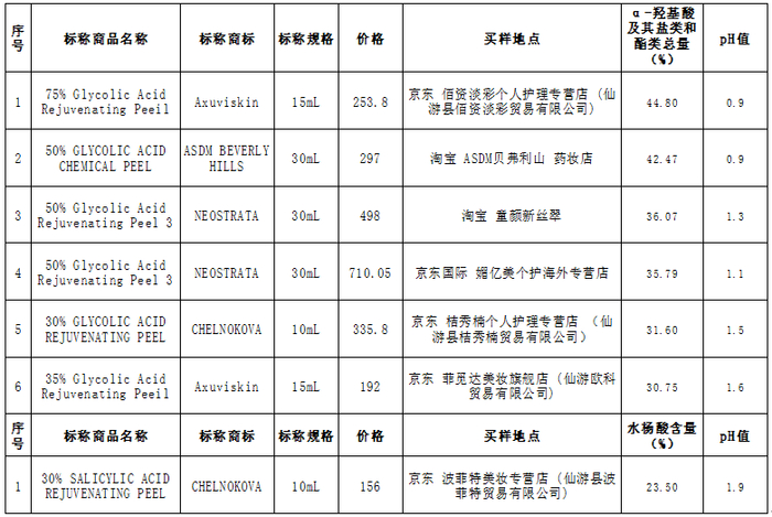 测试结果发现,不少刷酸产品存在酸浓度过高,超过的前述规范的6%(以酸计)浓度,还有一些产品存在PH值偏低等情况。