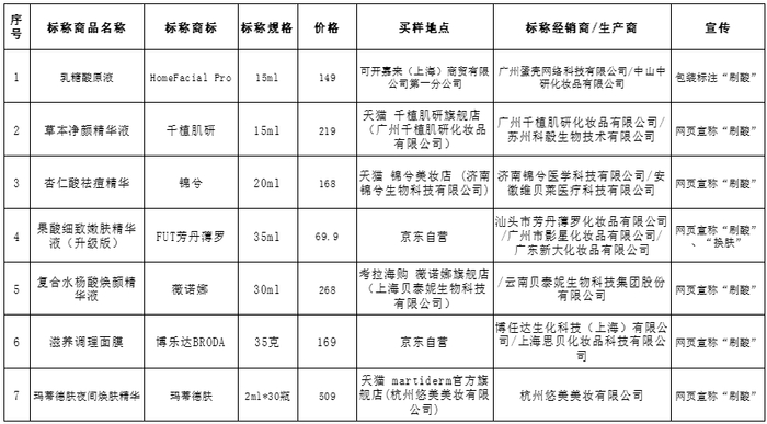 表三:7件样品包装或网页宣称有“刷酸”、“换肤”等字样。