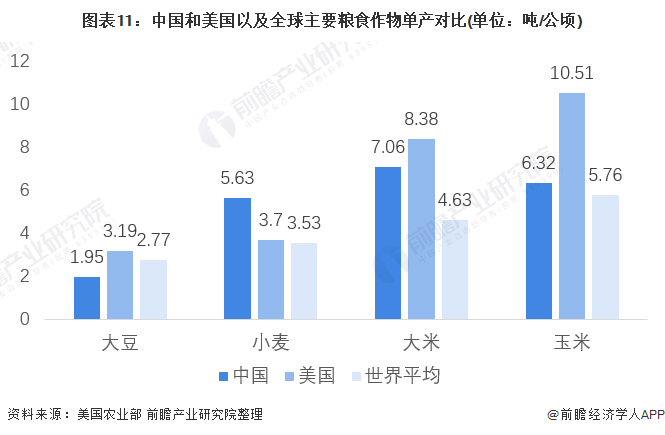 我国目前广泛采用杂交技术,在小麦、大米和玉米等主要粮食作物上都广泛运用。从我国单位不同粮食作物产量和全球以及美国对比来看,我国小麦、大米和玉米等粮食作物的单位面积产量均高于世界平均水平。而在大豆作物上,我国单位面积产量仅为1.95吨/公顷,小于世界平均水平,这主要是由于世界在大豆种植上广泛采用转基因技术,但我国目前并没有允许在国内广泛种植转基因大豆。
