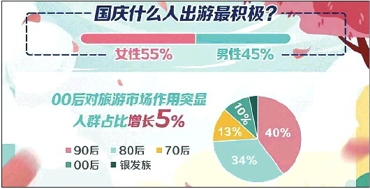 而从年龄结构看,90后继续领跑,占比40%;80后列位第二名,占比34%。值得一提的是,00后对旅游市场的作用逐渐凸显,今年国庆出游的00后占比同比去年增加5%。