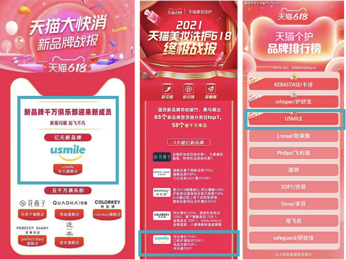 悄声快跑的usmile在今年6月牵手顶流艺人肖战, 官宣像护肤一样护理口腔。根据天猫官方战报显示,官宣当天usmile销售业绩势如破竹,一跃成为天猫618大快消第一个销售破亿新品牌 ,电动牙刷和冲牙器,一举斩获今年618双类目第一,品牌旗舰店内其他快消品,如漱口水、牙膏等也供不应求,618期间稳居口腔护理品类天猫市场份额第一。