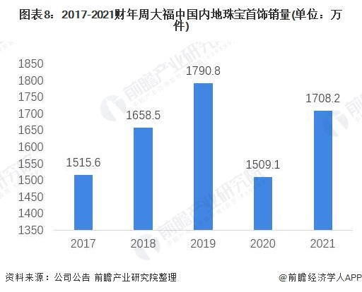 2017-2019财年,周大福在中国内地珠宝首饰销量持续上升,2019财年达到1790.8万件。2020财年受疫情影响,周大福销量大幅下跌,2021财年国内疫情基本得到控制,销量迅速回升,达到1708.2万件。