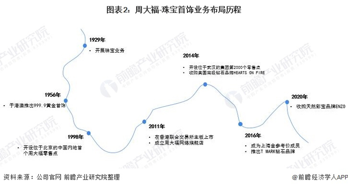 1929年周大福开始开展珠宝业务;1956年推出主打的999.9黄金首饰产品;1998年在北京开设中国内地首个零售点;2011年周大福在香港联合交易所主板成功上市;2016年周大福成为上海金参考价成员;2020年周大福收购ENZO,进军天然彩宝市场。近百年发展历程中,周大福不断通过收购等方式扩张珠宝首饰业务布局。