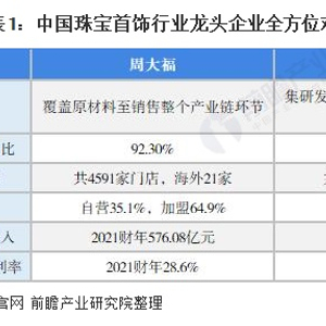 原标题:干货!2021年中国珠宝首饰行业龙头企业分析——周大福:中国珠宝行业的常青树 来源:前瞻产业研究院