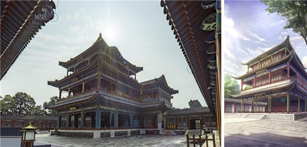 (德和园实拍&《恋与制作人》游戏场景图)