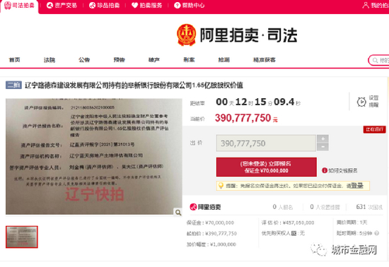 根据沈阳市中院的信息,由于此前辽宁路德森建设发展有限公司未能偿还阜新银行沈阳分行的贷款本金3.5亿元本息,沈阳分行把辽宁路德森公司告上法庭,并向法院申请强制执行。阿里拍卖平台也显示,辽宁路德森公司持有的阜新银行1.65亿股股权被强行拍卖。
