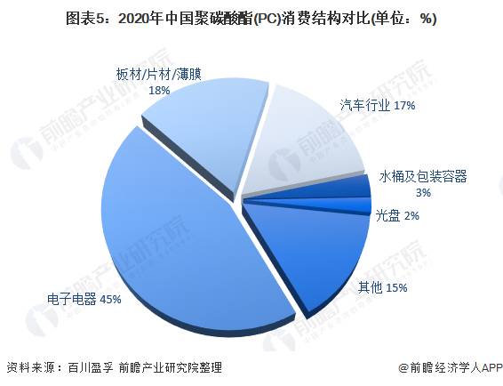 聚碳酸酯主要下游用户是电子电器、板材和汽车等领域,上述3个行业约占聚碳酸酯消费量的80%,其它主要是用于与其它聚合物共混,如生产ABS、聚对苯二甲酸乙二醇酯(PBT)或聚醚等。由于原料双酚A的安全问题,聚碳酸酯在食品包装、婴儿奶瓶和医疗设备等方面的应用还在摸索中。