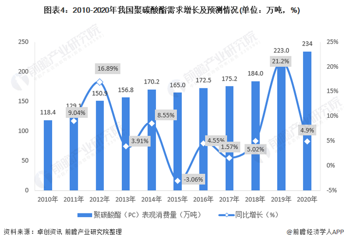 近年来,中国聚碳酸酯市场消费快速增长,2020年,我国聚碳酸酯表观消费量达到234万吨,同比增长4.9%。