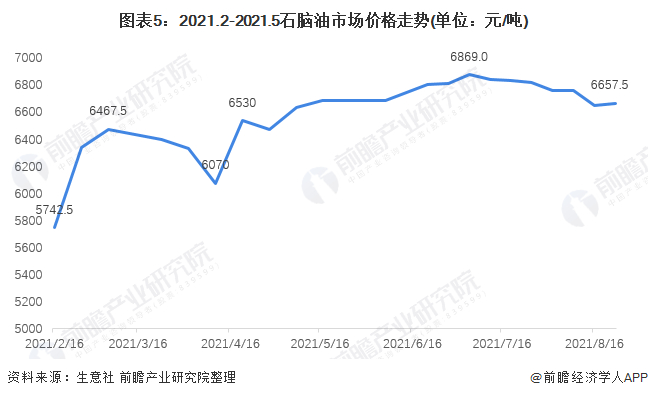 2021年2月以来,石脑油价格呈现波动上升趋势,波动范围在5742.5-6869.0元/吨之间,截止到8月23日国内地炼石脑油主流出厂均价为6657.5元/吨,较月初价格小幅回落。