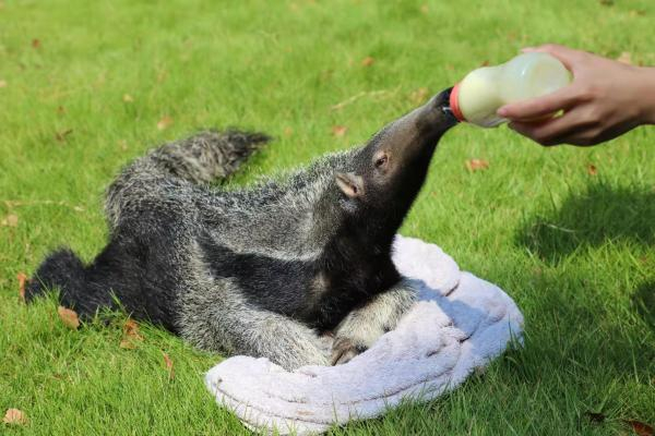 大食蚁兽宝宝嘴型特殊,即便是日常喂养也变得十分复杂。工作人员采用不同的奶嘴进行尝试,经十几次的训练,幼兽掌握了吮奶技能并顺利吮上了奶,完成了生存下来的必备技能——“会吃”。到一月龄时,幼崽一顿已经可以喝掉60毫升人工奶。如今,幼崽已经超过三月龄,可以食用由蚂蚁、猫粮、鸡蛋、牛肉、菠菜等饲料打碎的“酱料”,体重也涨到了10千克。