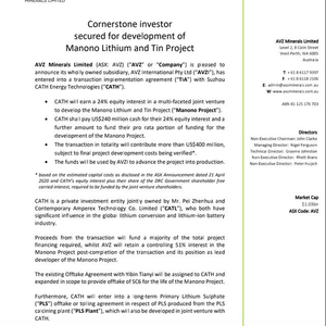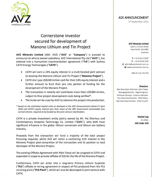 澳大利亚矿产勘探公司AVZ Minerals(ASX:AVZ)于当地时间9月27日宣布,该公司已经与中企苏州天华时代新能源产业投资公司(下称天华时代)达成协议,获得天华时代2.4亿美元(约合人民币15亿元)的注资后,将用于开发位于刚果(金)的锂项目Manono,天华时代将获得该项目公司24%股权。澳企AVZ透露,在开发成本核实后,宁德时代提供的资金将超4亿美元(约合人民币25.8亿元)。此外,两家公司或将继续合作,评估开发氢氧化锂设施的可行性。