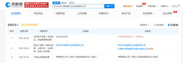 据天眼查数据显示,近日,苏州天华时代新能源产业投资有限责任公司发生工商变更,新增宁德时代新能源科技股份有限公司为股东,同时公司注册资本由2000万人民币增至16亿人民币,增幅7900%。