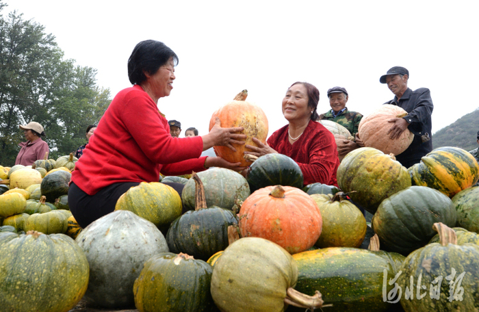 2021年9月24日,山西省灵丘县车河有机农业社区的村民在分捡有机南瓜。车河有机农业社区采取“有机农业+生态旅游+美丽乡村”模式,打造了“梦幽谷”“车河冰雪缘”等景点,举办“车河国际有机农业论坛”。