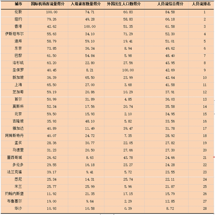 表8 2017年全球城市人员流量指数得分及结构排名