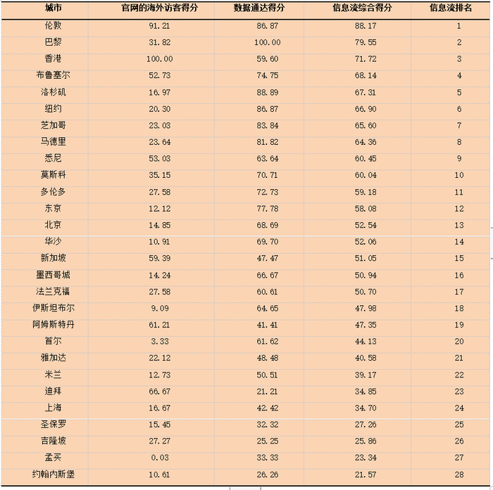 从信息流综合得分来看,伦敦、巴黎、香港分别位居前三。其中,伦敦最高,达到88.17,巴黎和香港紧随其后,分别排名第二和第三,其余城市得分则相差不大。同时,国内两座城市——香港、北京表现良好,分别排名第三和第十三。上海处于靠后的位置,排名第二十四。而印尼雅加达、德国法兰克福以及俄罗斯莫斯科则排在最后三位。