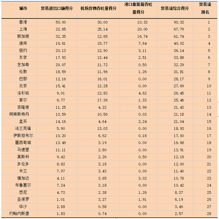 表4 2017年全球城市贸易流量指数得分及结构排名