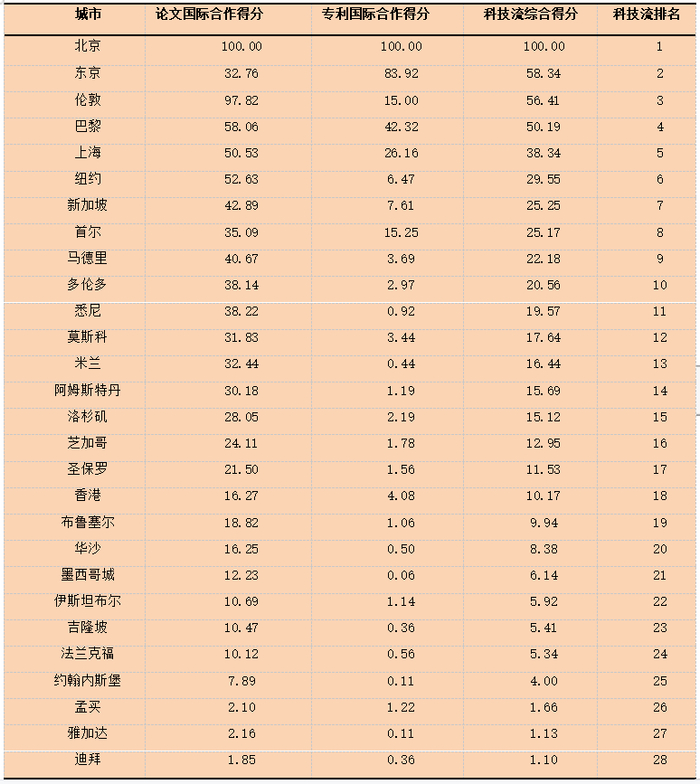 从科技流综合得分来看,北京、东京、伦敦分别位居前三,其中北京最高,达到100,排在首位,其次为东京(58.34),排在第二。北京在28座城市中排名第一,主要得益于其在专利国际合作和论文国际合作方面均居首位,且与第二名拉开较大距离。上海排名第五,次于巴黎。而孟买、雅加达以及迪拜等在所有城市中排名末三位。