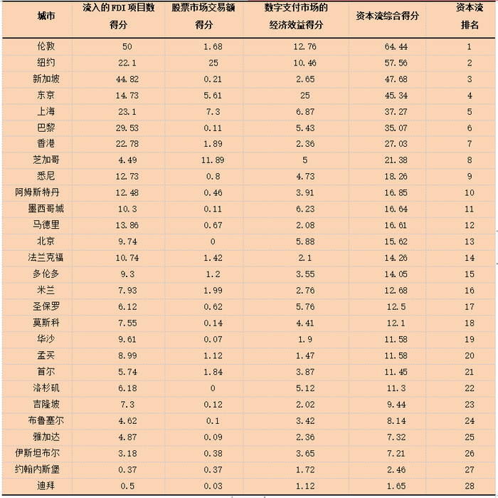 表5 2017年全球城市资本流量指数得分及结构排名