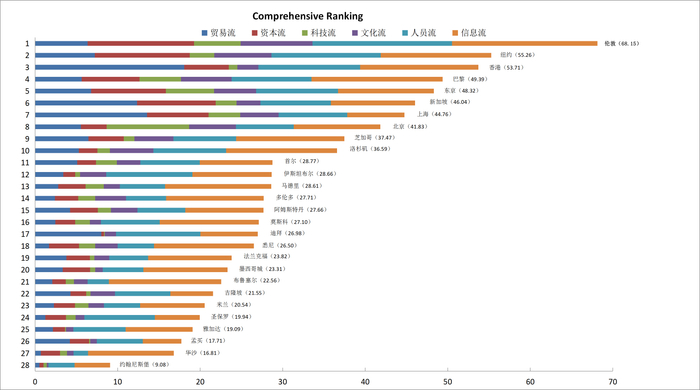 从贸易流指数来看,香港指数最高,达到了90.33,排在首位,其次为上海、新加坡、迪拜等城市。上海在所有城市中排名第二,主要得益于其较高的港口集装箱吞吐量和机场货运吞吐量。中国内地另一座城市北京,由于其属于内陆城市,在港口集装箱吞吐量方面取值为0,但在机场货运吞吐量方面占据一定的优势,总体来看,北京在贸易流发展方面处于中间靠前的位置。在美国的三座城市中,纽约排在了芝加哥和洛杉矶的前面,处于第五位,芝加哥和洛杉矶处于第七和第十一位。而巴西圣保罗、波兰华沙和南非约翰内斯堡则排在末三位。总体来看,亚洲城市在贸易流方面表现突出,前五位中占据三席,而欧美城市则略显尴尬。