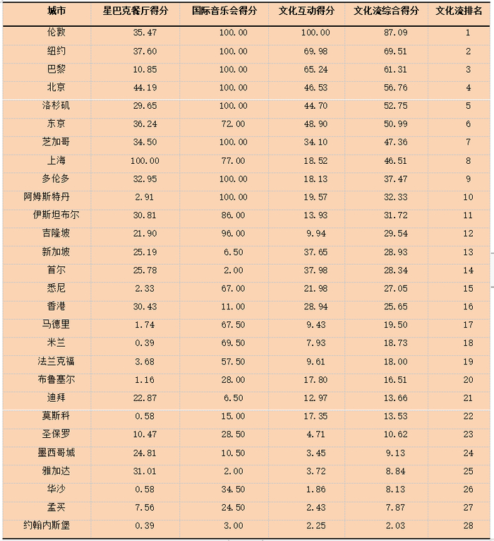 从文化流指数来看,伦敦、纽约、巴黎占据文化流前三的位置,其中伦敦(87.09)远超纽约(69.51)和巴黎(61.31),主要得益于其较高的国际音乐会指标和文化互动指标。北京在文化流综合得分中排在第四,主要是在国际音乐会方面与伦敦、纽约、巴黎等7个城市并列第一,提升了在该方面流量的资源配置优势。洛杉矶、东京和芝加哥紧随其后,其中洛杉矶和芝加哥的国际音乐会指标也在并列第一之列,东京则在三个二级指标里面分布较为均匀,显示出文化产业的均衡发展优势。中国上海位列第八,与第七名芝加哥仅有一分之差,而且星巴克餐厅指标排名第一。另外,中国的另一个城市香港在文化流排名方面略靠后,表明其在发展文化产业方面仍有进步空间。华沙、孟买、约翰内斯堡则排在所有城市的末三位。