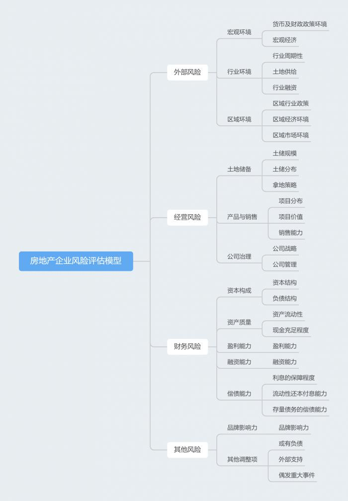 本系列报告将从各房企的经营风险、外部风险、财务风险和其他风险等四个维度(一级指标)出发评估房企的抗风险能力。该模型总共分为三级指标,各个指标测评分数均采用10分制。模型如下图所示: