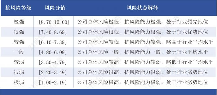 按照各个指标的评分,可将一家公司的抗风险能力划分为7个等级,其中8.7-10分表示抗风险能力等级“极强”,7.4-8.69分表示抗风险能力“很强”;6.1-7.39分表示“较强”;4.8-6.09分表示“一般”;之后的抗风险能力等级分别为“较弱”、“很弱”和“极弱”具体风险得分说明如下: