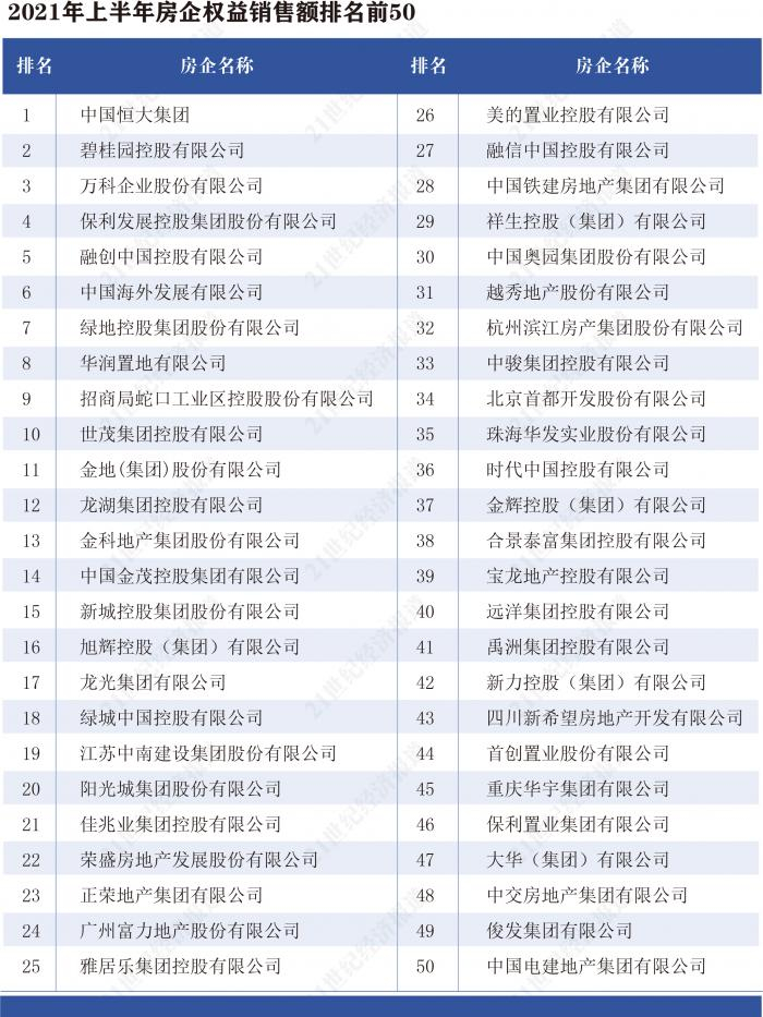 本报告以2021年上半年权益销售额排名前50的房企为测评对象(已剔除数据不全的4家房企海伦堡、佳源集团、敏捷集团和中铁集团),具体名单如下: