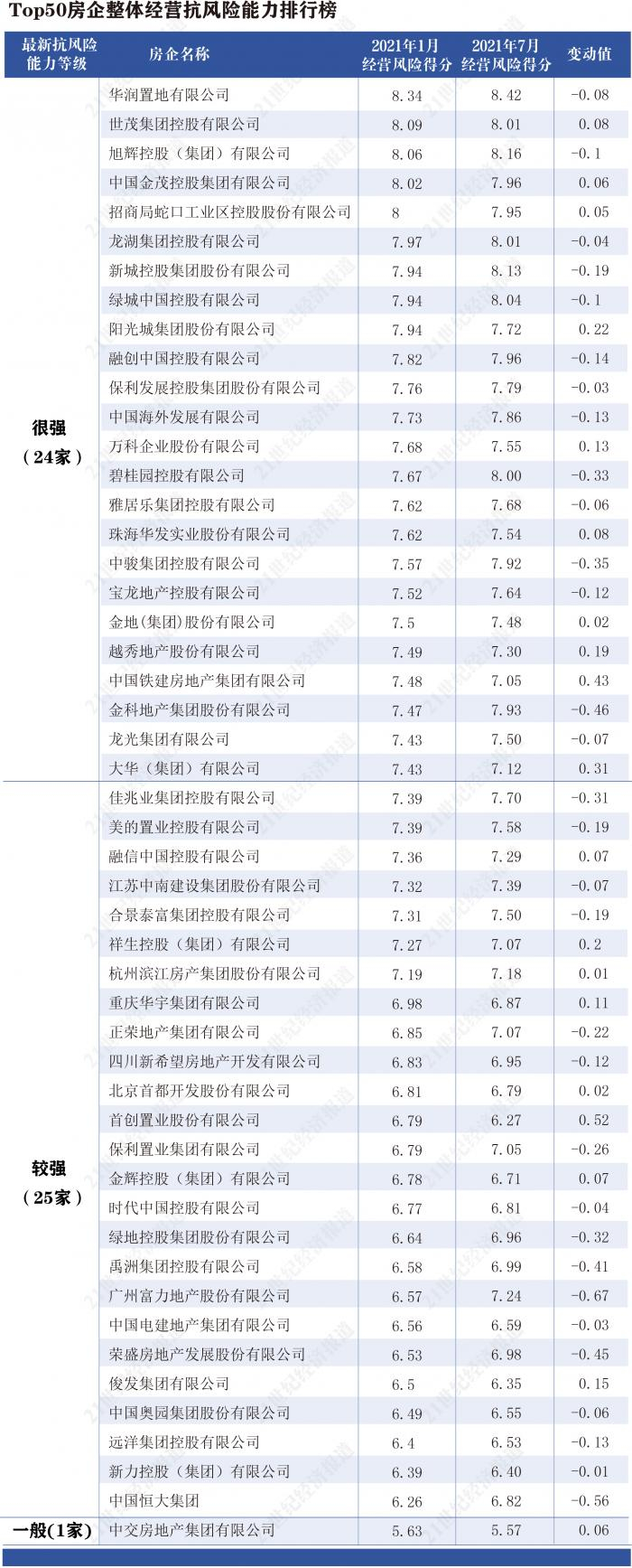中国恒大、新力控股、远洋集团、中国奥园等经营抗风险能力在前50强中排名靠后。