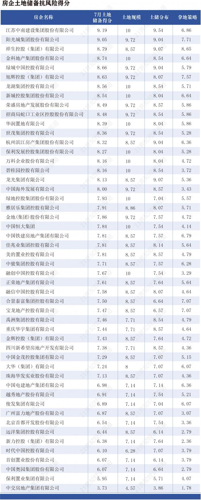 前50强房企今年7月的土储得分平均数为7.6分,中位数为7.76分,整体表现“很强”。其中土地储备得分位于“极强”级别的房企有4家,分别为中南建设、阳光城、祥生控股和金科地产。土储得分较低,被划分为“一般”及以下级别的房企为中国奥园、首创置业、保利置业等。