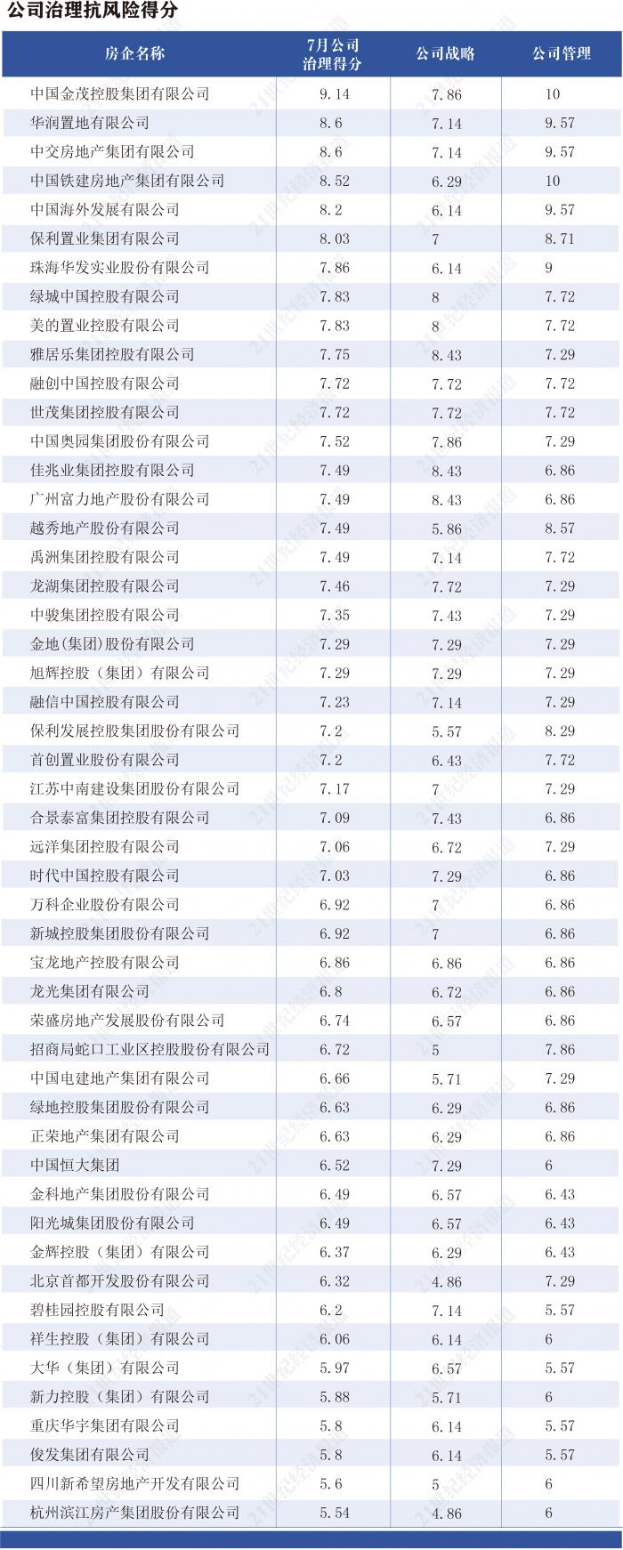 在公司治理的问题上,86%以上的房企得分较高,表现优秀,其中中国金茂公司治理方面抗风险表现“极强”,得分9.14分。