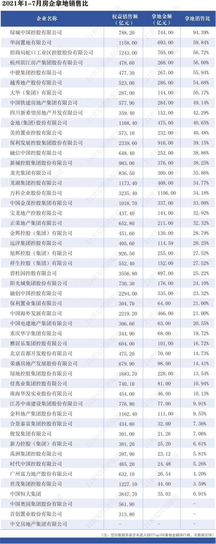 需要说明的是“拿地销售比不超过40%”的政策统计的是房企过去一年拿地销售比数据,我们统计的今年前7个月拿地销售比数据反映的是今年开发商拿地态度,仅供参考。