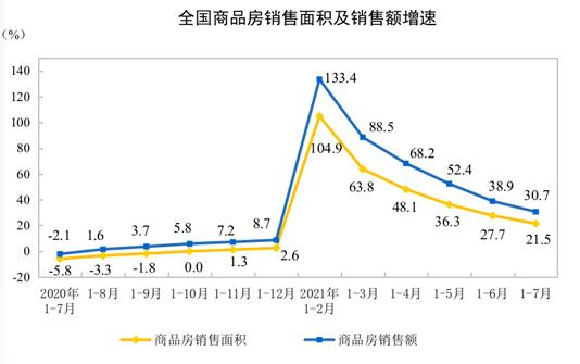 今年以来随着多地加大房地产调控力度、频出调控补丁,楼市明显降温,虽然各大房企加大力度促进销售回款,但近几个月销售回款速度或多或少还是受到了调控影响。国家统计局数据显示,今年前7个月全国商品房的销售面积和销售额增速呈现一个明显下降的趋势。