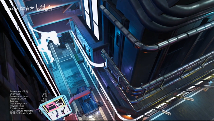 好在 Cocos 引擎一直没有放弃“补课”。BIGC 上,陈昊芝展示了两段视频,一段是类似《原神》风格的 3D 小游戏渲染,一段是使用 Cocos Creator 3.3 渲染的赛博朋克风 3D 手游渲染。