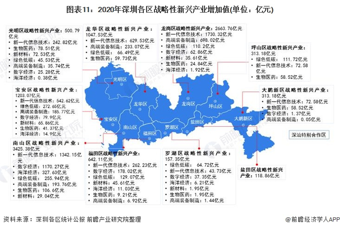 分区域看,2020年,南山区战略性新兴产业增加值最高,为3425.38亿元,新一代信息技术产业和数字经济产业为南山区战略性新兴产业的优势产业。龙岗区战略性新兴产业增加值全市排名第二,其战略性新兴产业增加值为2663.76亿元,新一代信息技术产业是龙岗区战略性新兴产业的细分优势产业。盐田区战略性新兴产业增加值最低,为118.86亿元。