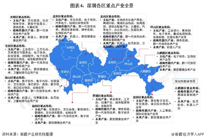 分区域看,南山区重点布局数字软件、数字内容、创意设计、文化旅游、演艺娱乐、通信、数字视听、生物医药、新材料、港口综合物流、金融、新一代信息技术、数字经济、机器人、可穿戴设备、航天航空、卫星制造与应用产业等。大鹏新区则重点布局电子信息、生物技术、新一代信息技术、新型健康技术产业等。其它区重点产业布局情况如下: