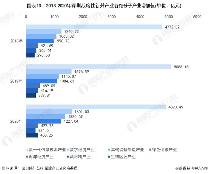 具体来看,新一代信息技术产业为深圳战略性新兴产业增加值贡献最大,2020年新一代信息技术产业增加值高达4893.45亿元。值得关注的是,生物医药产业在2018年为七大深圳战略性新兴产业增加值中最小的子产业,到了2020年,生物医药产业增加值超过新材料产业增加值,为408.25亿元。