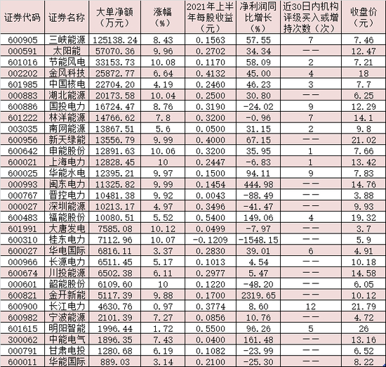 值得一提的是,近期机构对业绩稳定增长的绿色电力概念股关注度开始上升,上述上半年实现净利润同比增长的36家公司中,近30日内共有16只业绩成长股获机构点赞,长江电力、华能水电、三峡能源、华电国际、中国电建、明阳智能、绿色动力等7只业绩成长股近期均受到5次及以上机构扎堆推荐,后市表现值得期待。