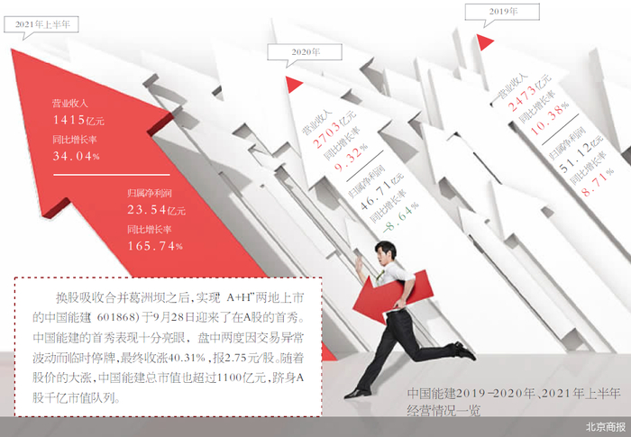 换股吸收合并葛洲坝之后,实现“A+H”两地上市的中国能建(601868)于9月28日迎来了在A股的首秀。中国能建的首秀表现十分亮眼,盘中两度因交易异常波动而临时停牌,最终收涨40.31%,报2.75元/股。随着股价的大涨,中国能建总市值也超过1100亿元,跻身A股千亿市值队列。
