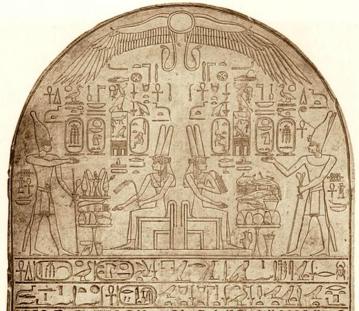 石碑正上方是太阳神伸出两个翅膀,垂下来的是两条圣蛇,一同庇佑王权。再下面左右两侧写着相似的短语,都可以翻译为“贝赫德特的伟大神祇”,但实际上古埃及有两个名为“贝赫德特”(Bḥdt)的地方,一个位于上埃及的埃德富(Edfu),另一个位于下埃及的特尔巴拉蒙(Tell el-Balamun)。这个双关的短语寓意,无论是上埃及还是下埃及,都在太阳神的护佑之下。接下来浮雕上写着“愿她永远长寿,王室中的贵夫人,法老尊贵的母亲特提舍利”。特提舍利(Tti-šri,意为“小特提”)是第十七王朝最后某位法老的妻子,她作为“法老母亲”的身份出现,而她的儿子正是第十八王朝的创立者阿赫摩斯。因此特提舍利不仅是神妻,也是法老之母,可以在法老年幼时监管朝政。在浮雕中,法老阿赫摩斯站在他母亲的面前,向她献上表达自己崇敬之意的物品。说明,从此时开始,“阿蒙神神妻”不仅是高级祭司,还具有监国的职能。