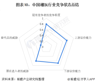 从五力竞争模型角度分析,由于目前,我国潮玩市场的竞争者逐渐增多,且各梯队都处于稳步发展中,现有企业间的竞争较为激烈;而潮玩属于“IP为王”的新兴行业,替代品威胁较小;潮玩行业的上游供应商一般为独立设计师或者工作室提供的IP,由于供应商数量较少,,且讲求创新和独特性,上游议价能力较强;下游消费市场主要是终端客户,因目前潮玩品牌较少,消费者的选择较少,因此下游的议价能力较强;此外,由于潮玩行业的进入门槛相对较低,且市场保持着稳定增长趋势,因此由较大的新进入者威胁。