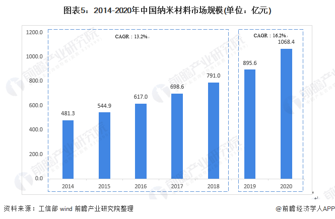 近年来,随着纳米材料生产技术的改良及下游需求增加的拉动,纳米材料的市场规模呈现了较快的增长趋势。中国纳米材料产业市场规模由2014年的481.3亿元增长到了2018年的791.0亿元,年复合增长率为13.2%。随着下游市场需求进一步扩大以及相关技术的逐渐成熟,2019年起中国纳米材料产业市场规模增速有所提升,前瞻根据纳米材料产业市场发展情况估计2020年中国纳米材料产业市场规模达到1068.4亿元,同比增速达16.2%。