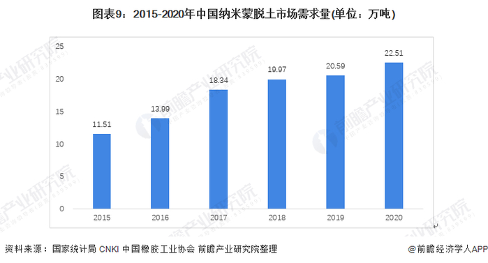 纳米级蒙脱土在橡胶中应用主要用于橡胶制品改性,主要包括气密性,定伸引力和耐磨性、防腐性、耐侯性、耐化学性等方面的改善。通过加入少量(如3%-5%)的纳米蒙脱土,可以使橡胶的强度、伸长率等性能大幅度提高,有的性能可提高数倍,可替代目前的白碳黑,甚至彻底取代传统的碳黑及其它填料,大大减少污染,是二十一世纪橡胶工业的一场革命。现阶段,中国橡胶消费量不断增长,纵观2015-2020年中国合成橡胶供需变化情况,结合纳米蒙脱土渗透率,前瞻测算得出2015-2020年中国纳米蒙脱土市场需求量波动上升,2020年约为22.51万吨,由于未来合成橡胶性能改进需求潜力巨大,前瞻认为纳米蒙脱土市场未来景气度较高。