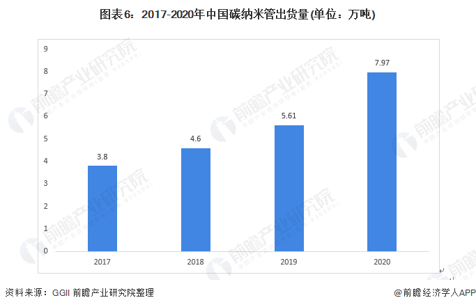 近两年中国新能源汽车市场由于补贴大幅退坡及其他因素影响,市场进入短暂调整期,导致动力电池出货量增速放缓,甚至出现下滑,这导致碳纳米管导电剂出现短期供需失衡,但受益于技术升级的带动,该材料市场增速表现好于下游锂电池市场。同样受益于动力电池市场规模需求的增长,近几年碳纳米管出货量呈现快速增长态势。结合高工产研锂电研究所(GGII)年复合增长率数据,前瞻测算2020年国内碳纳米管出货量达到7.97万吨。