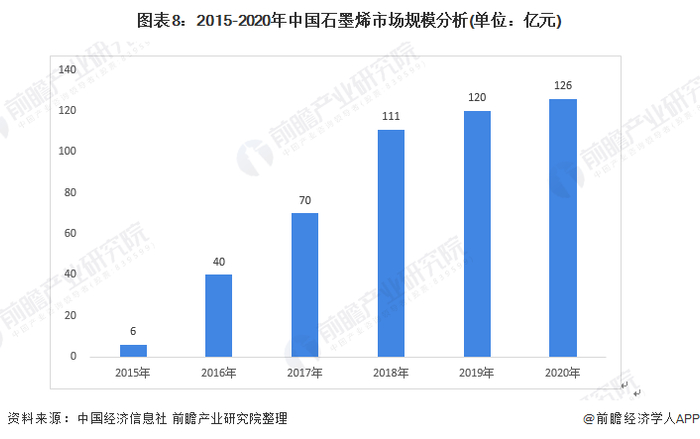 在高速发展后,从2019年开始石墨烯产业进入快速平稳发展期,增速有所降低。《2020年中国石墨烯产业发展形势展望》中估算2019年中国石墨烯规模达到120亿元,考虑到疫情的影响,前瞻测算2020年石墨烯市场增速将有所下降,石墨烯市场规模达到126亿元。