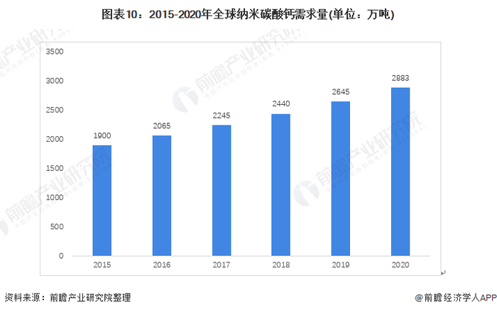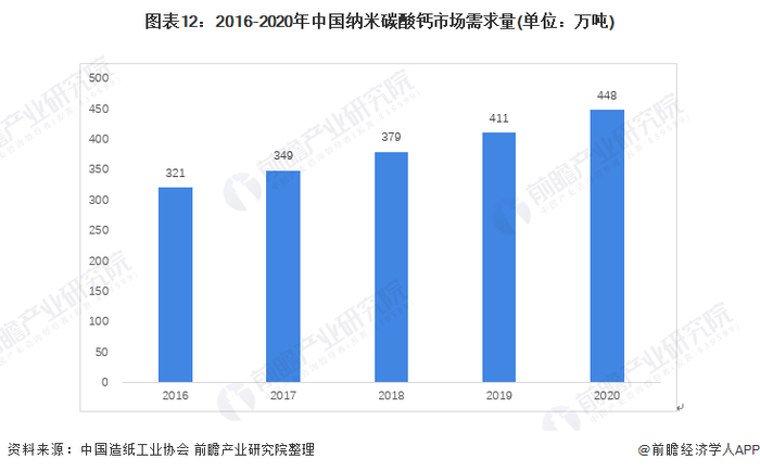 结合中国造纸工业协会发布的产业碳酸钙需求及纳米碳酸钙渗透率数据,前瞻测算得出,近年中国纳米碳酸钙需求量逐年上升,由2016年的321万吨逐渐增长至2020年需求量约为448万吨。