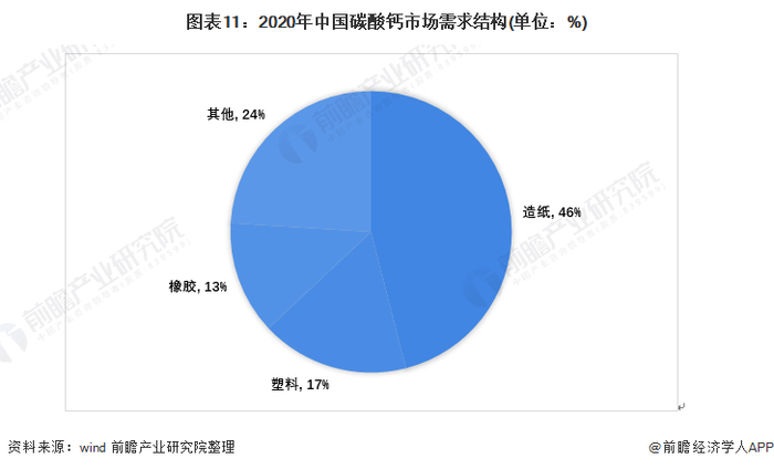 结合碳酸钙主要应用产业市场产量增速情况,前瞻经测算,认为目前造纸产业仍是碳酸钙最大的应用领域。2020年中国造纸产业碳酸钙需求占比最大,约为46%;第二大消费领域是塑料产业,消费占比为17%;橡胶产业需求占比约13%。