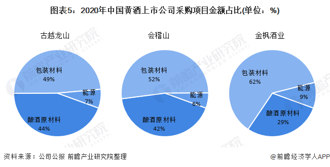 从我国主要黄酒上市企业采购项目和金额来看,包装材料和酿酒原材料是企业的主要采购项目,包装材料采购金额占比较高,其次为酿酒原材料,不同企业采购项目结构有多不同,古越龙山、会稽山包装材料占比在50%左右,而金枫酒业包装材料采购金额占比达60%以上。
