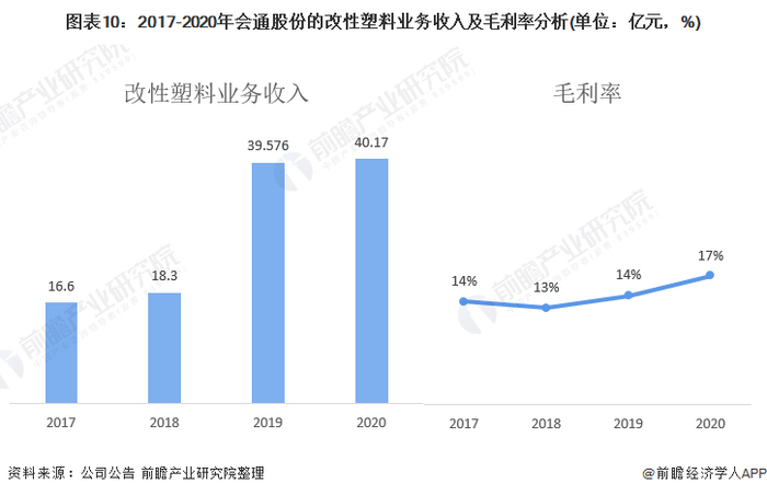 从改性塑料业务的经营情况来看,2017-2020年,会通股份的改性塑料业务呈上升态势,2020年会通股份改性塑料业务营业收入营业收入为40.17亿元,同比增长了1.5%。